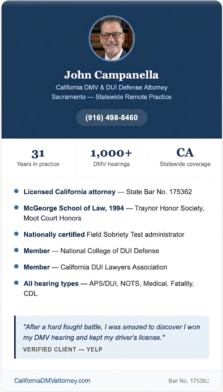 I'm John Campanella. I've been defending California drivers at the DMV since I started practicing law in 1995. That year I attended my first DUI conference in Sacramento, where I heard legendary defense attorneys speak about the science and strategy of fighting DUI and DMV cases. I was hooked. I've been studying this field ever since.